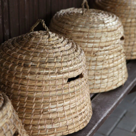 Deze bijenkorf is met de hand gevlochten. Dit natuurlijke ontwerp is stevig en geliefd door bijen. Het biedt bescherming en een onderdak voor de bijen.