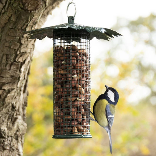 Deze voedersilo voor noten heeft een ontzettend leuk ontwerp. De versiering van het dakje in de vorm van boombladeren laat de silo minder opvallen tussen bladeren. Maar geeft tegelijkertijd ook karakter aan het ontwerp. Daarnaast is het dakje ook functioneel. Het middelpunt ligt namelijk iets hoger dan de rand van het dakje. Bij regen blijven de noten dus niet alleen droog, maar het water loopt ook gemakkelijk van het dakje af zonder de noten nat te maken. En dankzij het stevige staal is de constructie van de silo ook stevig. Daardoor kun je jarenlang vogels een handje helpen met het vinden van eten.Â