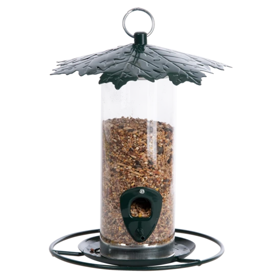 Deze voedersilo is echt oogverblindend mooi ontworpen. Over zowel de functionaliteit als het uiterlijk is goed nagedacht. Het bladerdak geeft de voedersilo niet alleen karakter, maar geeft de vogels ook een beschut en veilig gevoel. En omdat het dakje wat verder uitschiet, over de silo eronder, blijven ook de restjes, die in de opvangschaal eronder vallen, droog tijdens de nattere weersomstandigheden.