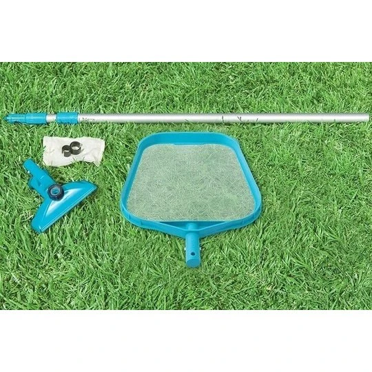 Met dit onderhoudsset heeft u alles in huis om uw zwembad schoon te houden. Het set bevat een telescopische, aluminium stok met verwisselbare hoofden, waaronder een schepnet.