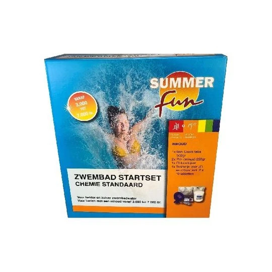 De Summer fun startset chemie standaard is ideaal voor het starten van een privé zwembad. Deze set bevat alle chemie om het bad probleemloos en veilig in gebruik te nemen. De handige doos bestaat uit 180 tabletten mini quick, 0,5kg pH-(min), 1x testset voor het meten van chloor en pH (inclusief 2×10 tabletten), en 1 chloordrijver. Lees voor gebruik van deze chemie eerst het etiket en de productinformatie.